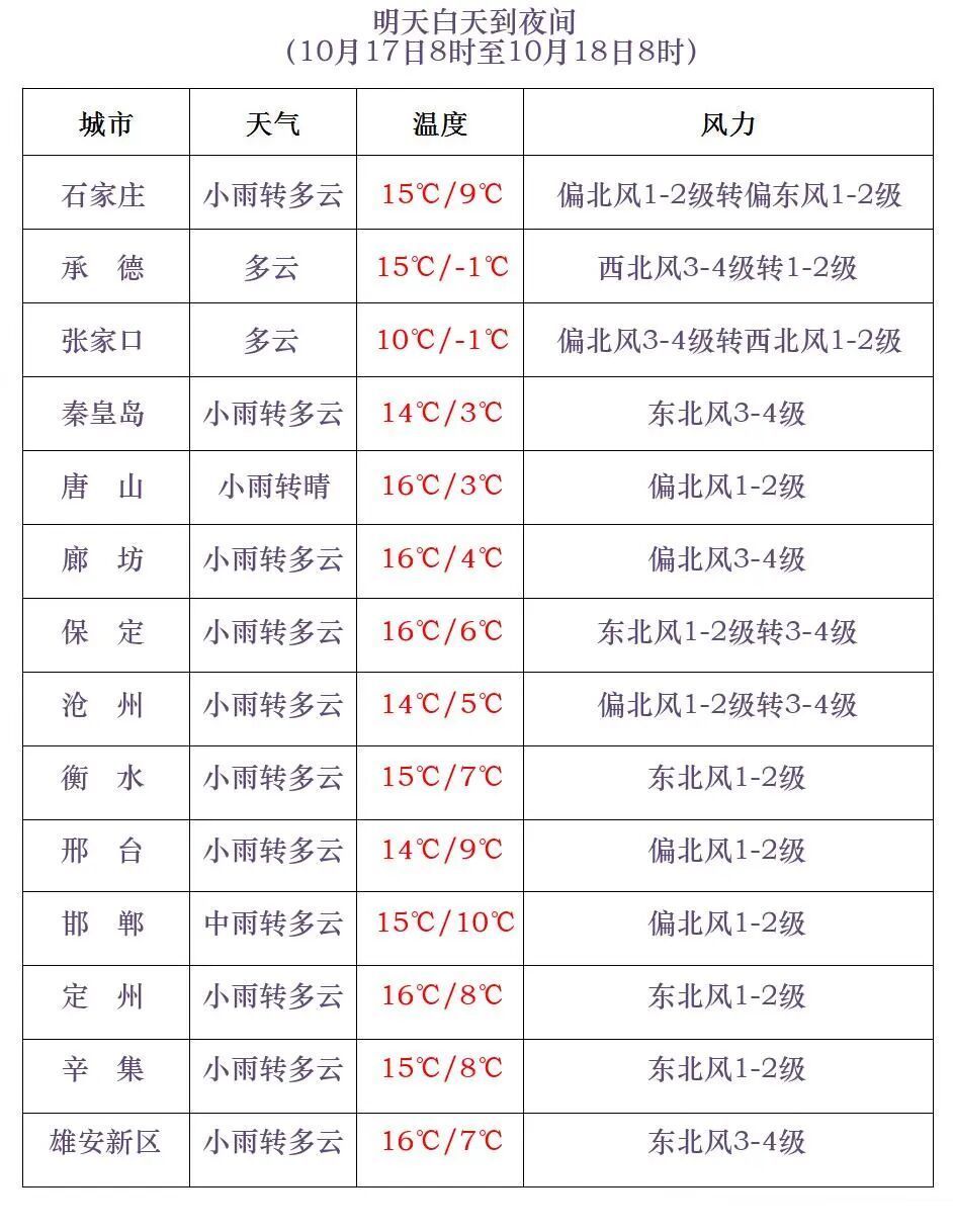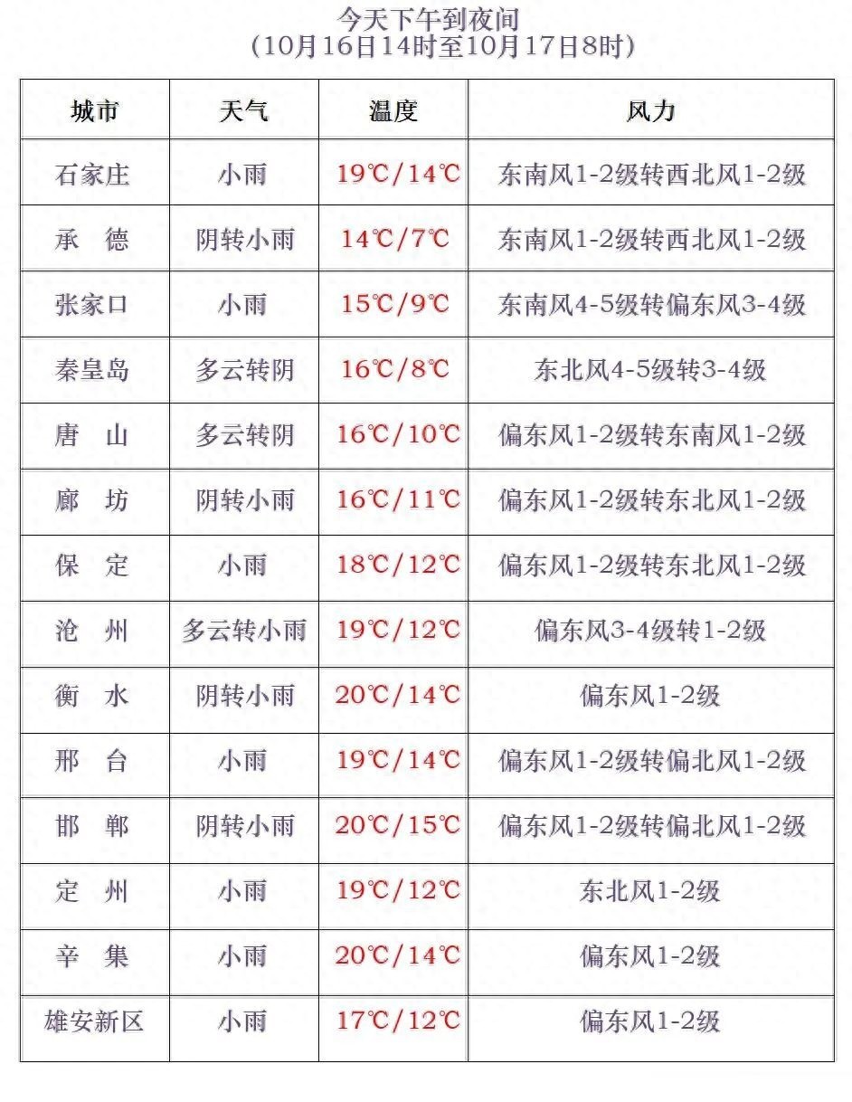 今天下午到夜间,唐山中南部、秦皇岛南部、沧州东部多云转阴,其他地区阴有小雨,局地有中雨,其中坝上地区有雨夹雪。