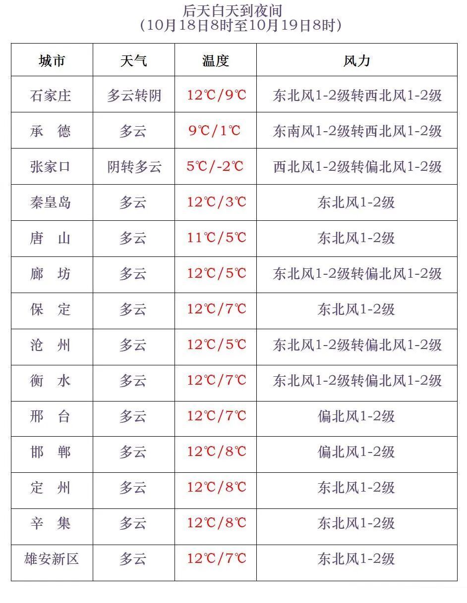 18-19日早晨,张家口、承德、保定西北部最低气温下降8~12℃,其他地区下降5~8℃。保定、廊坊以北地区有霜冻,其中坝上地区有冰冻。