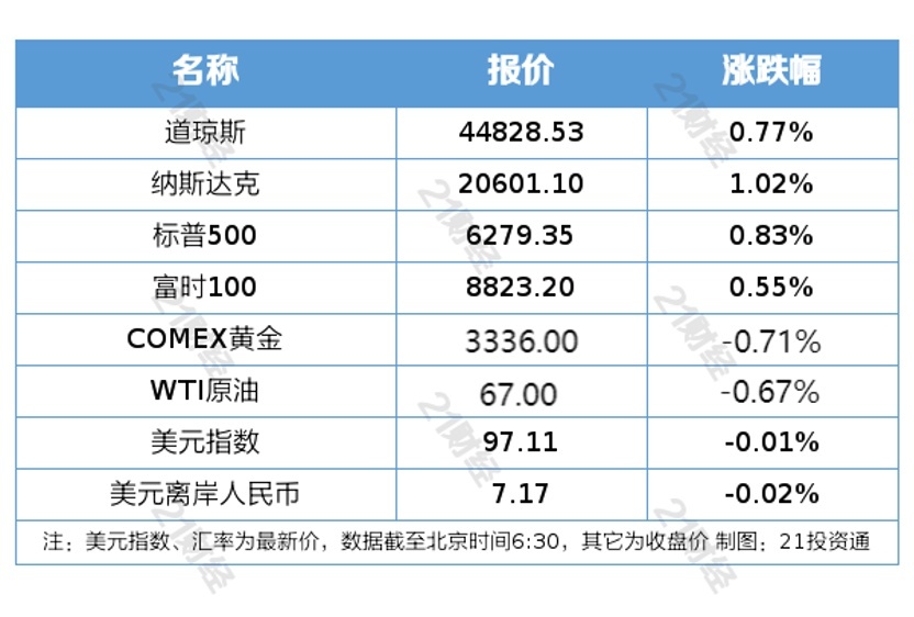 纽约股市三大股指7月3日上涨。截至当天收盘,道琼斯工业平均指数比前一交易日上涨344.11点,收于44828.53点,涨幅为0.77%;标准普尔500种股票指数上涨51.93点,收于6279.35点,涨幅为0.83%;纳斯达克综合指数上涨207.97点,收于20601.10点,涨幅为1.02%。